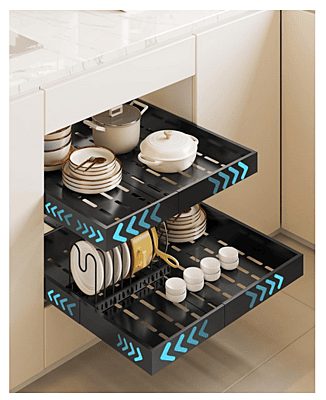 Pull-out drawer organizers are storage solutions designed to maximize the accessibility and organization of items within cabinets and drawers.