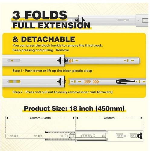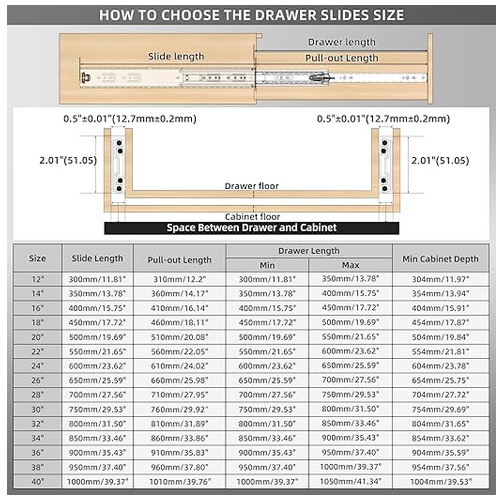 Heavy Duty Drawer Slides - Pair - Side - 18 inch Length: 17.72"(450mm); Full extension length: 35.83"(910mm); Installation clearance: Left: 0.50" (13mm); Right: 0.50" (13mm).