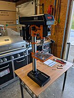 Features a 6.2-amp induction motor, a 10-inch swing, and a 2-inch spindle travel Adjust the mechanical variable speed anywhere from 530 to 3100 RPM Digital speed readout displays current RPM of the machine for maximum precision Measures in at 13.2 by 19.3 by 33.9 inches in size with a weight of 57 pounds Includes a class IIIA 2.5mW laser, adjustable depth stop, beveling 8 by 7.5-inch work table, 1/2-inch capacity keyed chuck, a chuck key with onboard storage