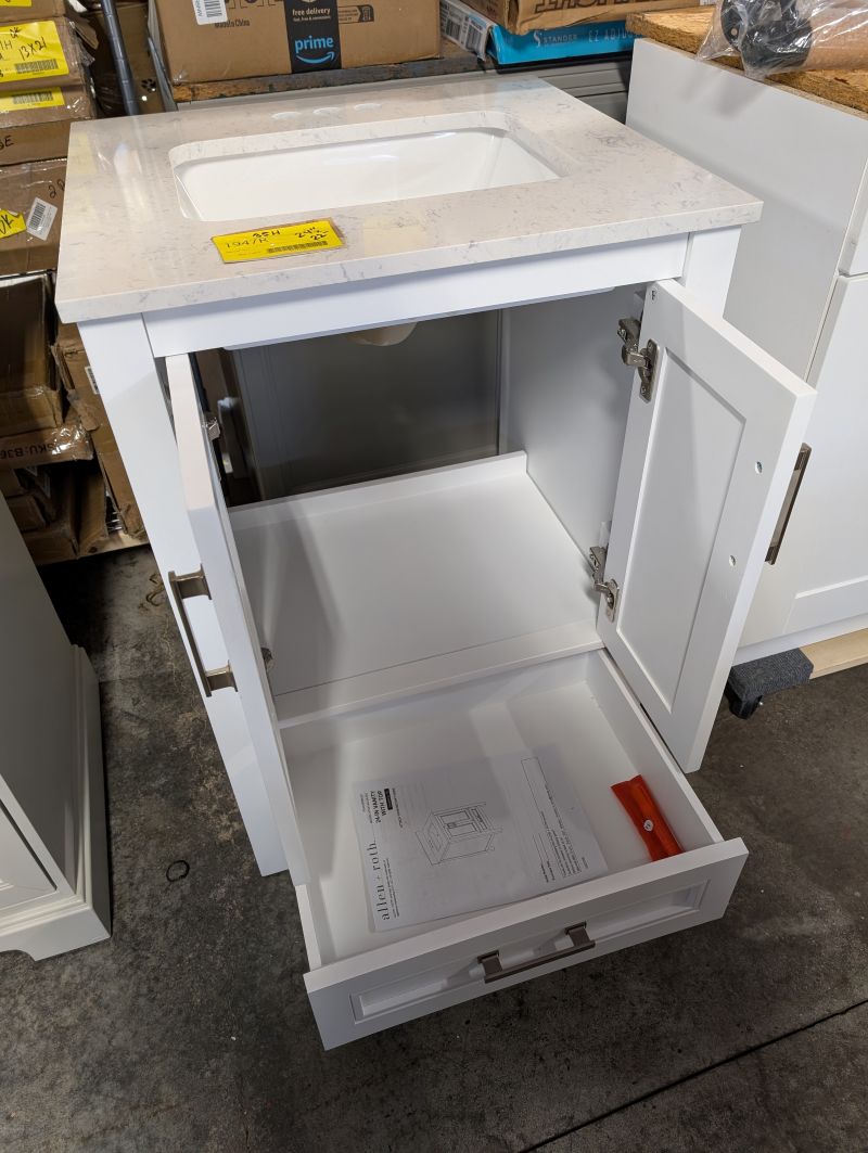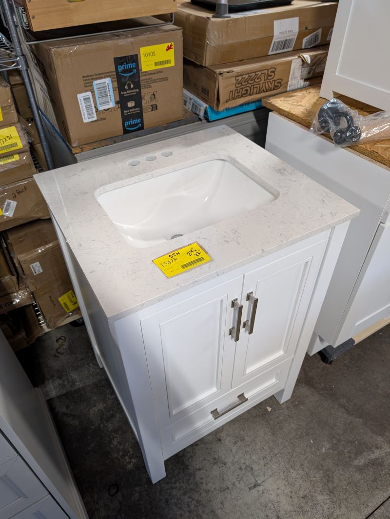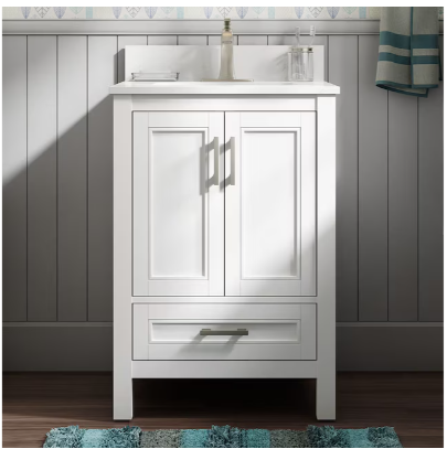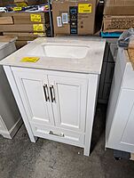 Bathroom Vanity - allen + roth - White - Carrara Marble Top - 24x22x35 Check out my full inventory at: re-boxed.shop 1947R Currently selling on Lowes (w/ top) for $399 **Vanity top has small chip on left side - see pic** Vanity Dimensions: 24w x 22d x 35h Bring an air of simple elegance to the smallest of bathroom spaces with this allen + roth vanity. The white finish and engineered Carrara marble top work perfectly with the brushed nickel hardware. The soft-close doors open to reveal an interior storage shelf, and a soft-close drawer sits below it for additional storage. Cash, Paypal, Venmo or in-person Credit Card only... No Trades... If it's listed, It's available Pickup only - 127 Ridge Road, Kersey, PA Check out my full inventory at: re-boxed.shop