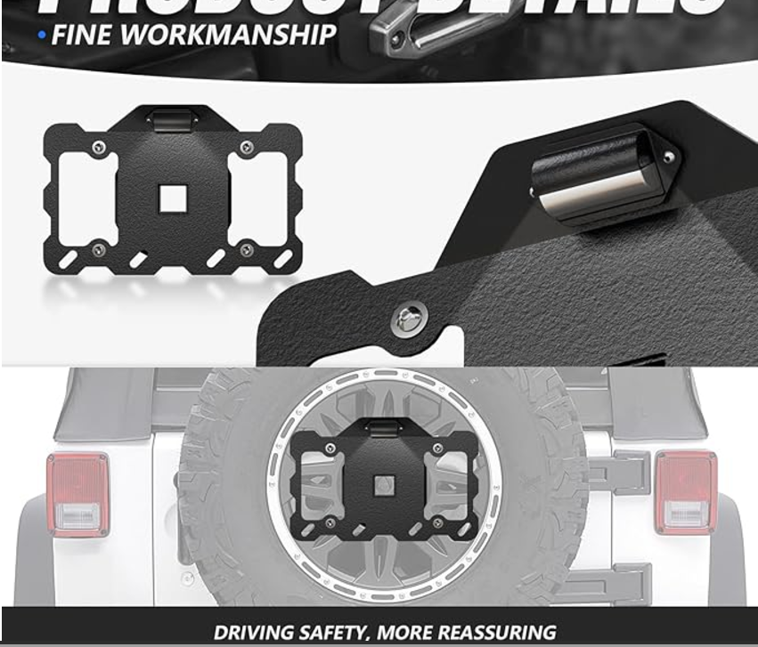 Jeep Spare Tire License Plate Frame with LED Light New never used Selling at Amazon for $40 **There is a small paint chipping - see pic closeup Color black Brand YZONA Vehicle Service Type Spare Tire License Plate Frame with LED Light Compatible with 1987-2018 Jeep Wrangler JK JKU & TJ & YJSpare Tire License Plate Frame with LED Light Compatible with 1987-2018 Jeep Wrangler JK JKU & TJ & YJ Item Weight 5.5 Pounds Finish Type Powder Coated