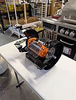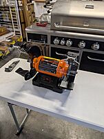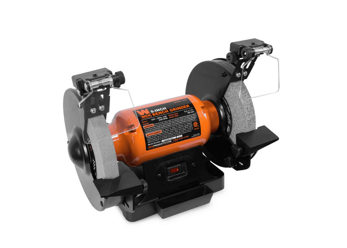 - 4.8-amp motor turns the 8-by-1-inch grinding wheels at speeds of up to 3450 RPM - Perfect for reviving old tools, knives, bits and more - Adjustable eye guards include built-in LED lights to keep your workpiece illuminated - Onboard quenching tray helps cool down workpieces during long grinding sessions - Includes one 60-grit wheel, one 36-grit wheel, pivoting tool rests, adjustable eye guards, built-in LED lights